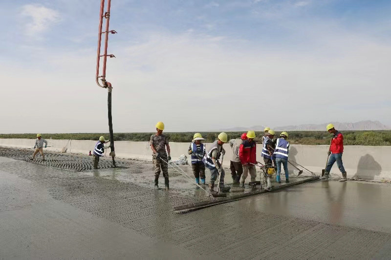 葉爾羌河特大橋全長2888m,上部結構橋跨為96×30m,共24聯(lián),橋梁寬11。箱梁調(diào)平層厚度12cm,所需澆筑C50混凝土4147.2m³,D12帶肋鋼筋網(wǎng)片708t,橋面鋪裝橫向按整橋凈寬、縱向按一聯(lián)一次澆筑。