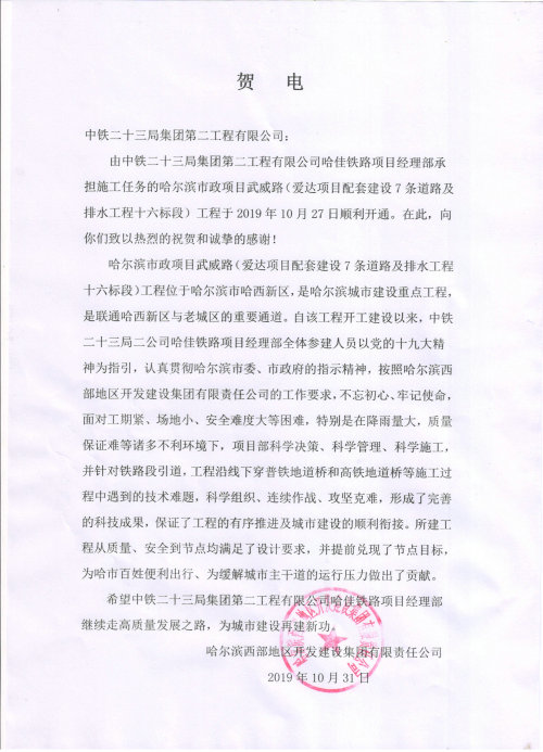 11月9日,中鐵二十三局二公司哈佳鐵路項(xiàng)目部收獲了哈爾濱西部地區(qū)開(kāi)發(fā)建設(shè)集團(tuán)有限責(zé)任公司發(fā)來(lái)的賀電,祝賀承建的哈爾濱市政武威路工程的正式開(kāi)通。
