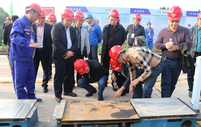 重慶交通委總工程師李關(guān)壽對梁場職工創(chuàng)新預制件支座調(diào)整器給以高度贊揚
