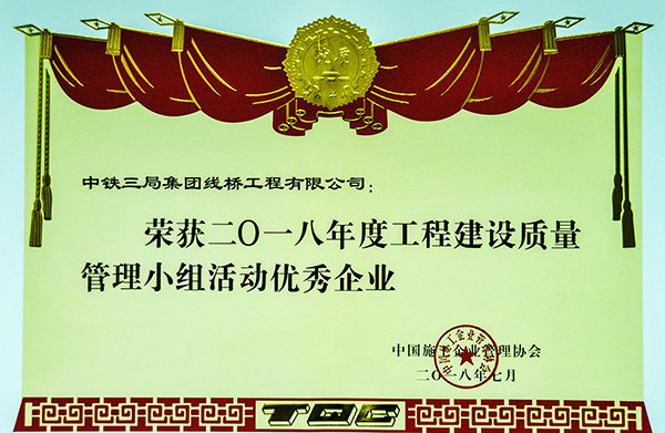 近期,中鐵三局集團線橋工程公司喜獲中國施工企業(yè)協(xié)會頒發(fā)的2018年度“工程建設質(zhì)量管理小組活動優(yōu)秀企業(yè)”、“工程建設質(zhì)量管理小組活動卓越領導者”、“工程建設優(yōu)秀質(zhì)量管理小組二等獎”、“工程建設質(zhì)量管理小組活動優(yōu)秀推進者”等多項榮譽。