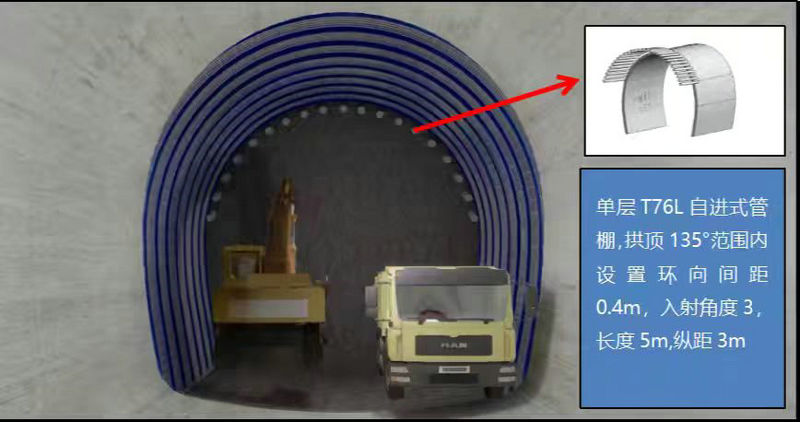 再次在下穿鐵路兩側(cè)各50米范圍內(nèi),初期支護采用厚度為230毫米的Ф8@200X200毫米掛網(wǎng)噴射鋼纖維混凝土,同時配合使用間距為0.5米的工16型鋼拱架。初期支護完成后,及時進行初支背后充填注漿,以確保支護結(jié)構的穩(wěn)定。在超前支護方面,采用拱部135度范圍內(nèi)的單層T76L自進式管棚,管棚長度為5米,環(huán)距400毫米,縱距3米,外插角為3度,有助于增強隧道結(jié)構的穩(wěn)定性和安全性。