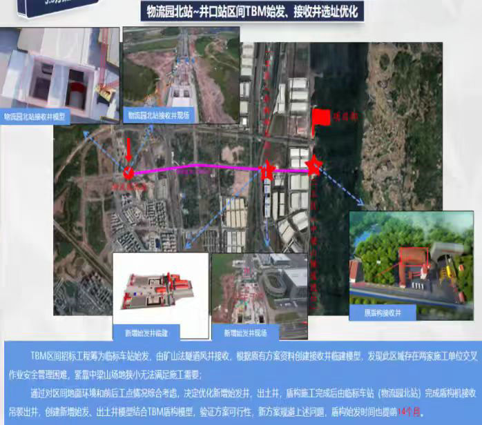 通過對區(qū)間地面環(huán)境和前后工點情況綜合考慮,決定優(yōu)化新增始發(fā)井、出土井,盾構施工完成后由臨標車站(物流園北站)完成盾構機接收吊裝出井,創(chuàng)建新增始發(fā)井、出土井模型結(jié)合BIM盾構模型,經(jīng)驗證方案可行性,新方案規(guī)避了上述問題,使盾構始發(fā)時間提前了14個月,2024年11月1日,物流園北站~井口井站TBM區(qū)間隧道結(jié)構分部工程順利通過驗收,為提前實現(xiàn)中梁山隧道進出口全線貫通和工程竣工驗收夯實了基礎。
