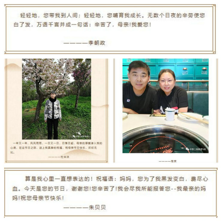 ”親愛(ài)的楊老大,小時(shí)候你放棄工作在家?guī)遥L(zhǎng)大后你又把我送到單位。每一次回家看見(jiàn)你越來(lái)越多的白頭發(fā)總覺(jué)得很心酸,希望你不要在老了。沒(méi)有你就沒(méi)有我,就沒(méi)有我數(shù)十寒暑的悲傷,也沒(méi)有我春夏秋冬的歡笑,謝謝您給了我生命中美好的一切與成長(zhǎng)。母親節(jié)快樂(lè)!“——高佳