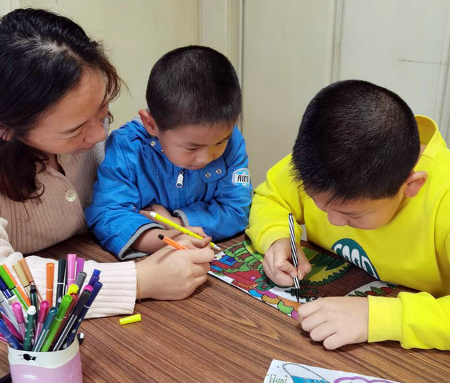 (安質(zhì)部鄭云雷,長子鄭春譯 10 歲,小學(xué) 3 年級,喜愛畫畫,次子袁鴻鈺 4 歲,幼兒園學(xué)前教育,喜愛拼積木,兩人正在精心創(chuàng)作作品)