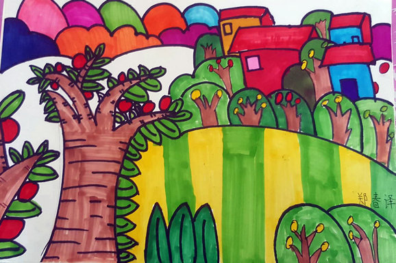 (鄭春譯創(chuàng)作的兒童畫色彩明快,線條流暢)
