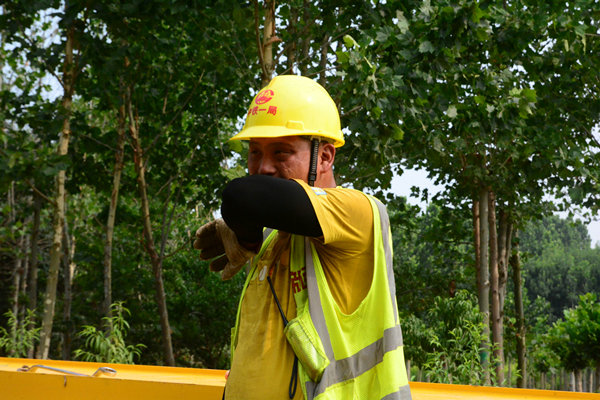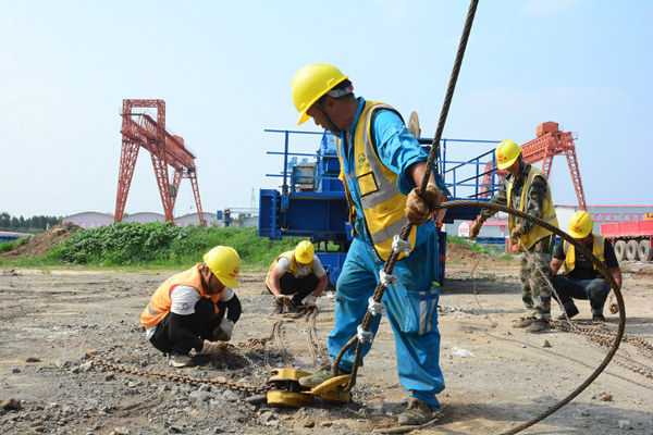 上午7時許,設(shè)備拆解現(xiàn)場總指揮柴兵一聲令下,兩臺大噸位吊車緩緩起鉤,提梁機主體拆解工作正式拉開序幕。安全員全程盯控,現(xiàn)場指揮與吊車司機緊密配合,一個小時后1號提梁機機臂成功落地。隨后,工作人員頭頂烈日,開始剛?cè)嵬鹊牟鸾夤ぷ?。來自陜西的年輕工友雷人龍抹了把臉上的汗,瞇著眼睛笑著說道,今天要拆上百條螺栓,手上若不戴上工作手套,掌心就會磨脫皮,兩三個小時就要磨爛一雙新手套??柿?,工人們會到旁邊歇幾分鐘,500毫升一瓶的礦泉水,咕咚咕咚兩口就沒了。
