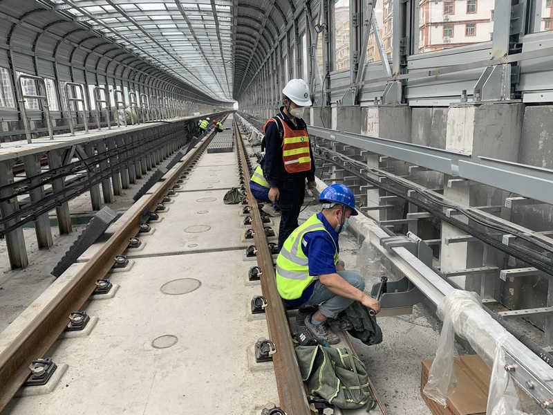施工過程中,為確保業(yè)主要求的“3.15”節(jié)點(diǎn)目標(biāo),項(xiàng)目部管理人員在元宵節(jié)后便陸續(xù)到崗,嚴(yán)格落實(shí)部署疫情期間開工防控措施和準(zhǔn)備工作,嚴(yán)格加強(qiáng)疫情期間現(xiàn)場(chǎng)防疫和施工安全的雙重管控。施工關(guān)鍵階段,公司緊急從杭州、上海、廣州各項(xiàng)目調(diào)集30余名技術(shù)、施工人員,并委派鐵成班組4名技術(shù)骨干加入,為現(xiàn)場(chǎng)施工提供了強(qiáng)有力的人員保障;項(xiàng)目部倒排工期,每日召開碰頭會(huì),發(fā)揮連續(xù)作戰(zhàn)的“鐵軍”精神,90多名施工人員及管理人員晝夜奮戰(zhàn),全力以赴攻堅(jiān)節(jié)點(diǎn)目標(biāo),施工現(xiàn)場(chǎng)多點(diǎn)開花,各項(xiàng)施工高效推進(jìn),先后于3月15日順利通過熱滑試驗(yàn)、4月2日開始試運(yùn)行、7月31日通過竣工驗(yàn)收,優(yōu)質(zhì)高效地完成了各個(gè)節(jié)點(diǎn)工期,確保了全線的順利開通。