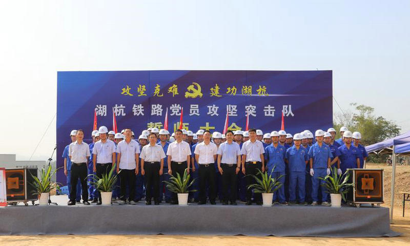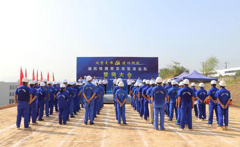 活動(dòng)上,中鐵十一局集團(tuán)有限公司湖杭鐵路項(xiàng)目經(jīng)理羅建軍提出,舉行“攻堅(jiān)克難,建功湖杭”黨員攻堅(jiān)突擊隊(duì)誓師大會(huì),目的只有一個(gè),就是以此為起點(diǎn),向著我們湖杭項(xiàng)目的五項(xiàng)重點(diǎn)卡控工程發(fā)起攻堅(jiān)沖鋒,現(xiàn)在已經(jīng)到了決戰(zhàn)決勝的關(guān)鍵時(shí)刻。他強(qiáng)調(diào),要認(rèn)清形勢(shì),再鼓干勁,迅速掀起攻堅(jiān)突擊高潮。項(xiàng)目部要積極配合各黨員攻堅(jiān)突擊隊(duì),超前做好施工準(zhǔn)備工作,有效投入精力,優(yōu)化施工方案,合理調(diào)配人員、設(shè)備和物資材料,保障五項(xiàng)重點(diǎn)卡控工程現(xiàn)場(chǎng)的有序施工。今年是習(xí)總書(shū)記提出“兩山”理論的十五周年,項(xiàng)目各級(jí),特別是擔(dān)負(fù)具體任務(wù)的各黨員攻堅(jiān)突擊隊(duì),一定要正確處理好生態(tài)環(huán)境與工期效益的關(guān)系,力求在不損害生態(tài)環(huán)境的前提下合理推進(jìn)施工進(jìn)度,確保“兩手抓、兩手贏”。