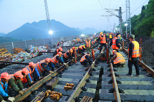 同時,項目部不斷加大安全及運輸組織盯控,增調數臺先進換枕、撥道及大型機械設備,10余家專業(yè)外協(xié)勞務隊伍,3000余名員工24小時不停歇的奮戰(zhàn)在站改施工一線。并且在公司的大力支持協(xié)調下,一、二、三、四分公司所屬員工紛紛走進涪秀,齊力攻堅涪秀二線鐵路的建設。