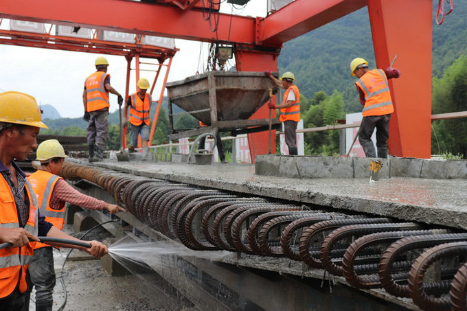 圖為員工慶祝鋼板組合梁橋面板預(yù)制完成 施工過程中,由于現(xiàn)場施工質(zhì)量受操作人員技術(shù)素質(zhì)影響大,而且受中孔道壓漿質(zhì)量難以檢查和控制等因素制約,為有效解決施工難點(diǎn),施工中將標(biāo)準(zhǔn)化、規(guī)范化貫穿全過程,嚴(yán)把施工工藝和工序及原材料質(zhì)量關(guān),不斷優(yōu)化施工組織,強(qiáng)化砼配合比試驗(yàn)控制,采集最佳數(shù)據(jù),利用蒸汽養(yǎng)生,有效提高了工程質(zhì)量,張拉和震搗中堅(jiān)持專人負(fù)責(zé)、專人控制,減少人為因素導(dǎo)致的差異,確保了砼質(zhì)量穩(wěn)定,大大提高了成品率。