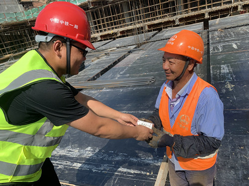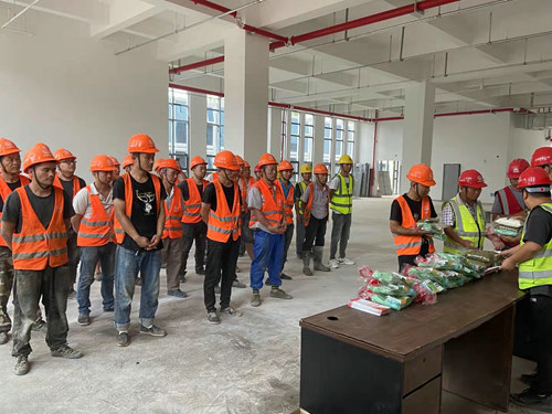 管理人員為外協(xié)隊伍工人發(fā)放防暑物品