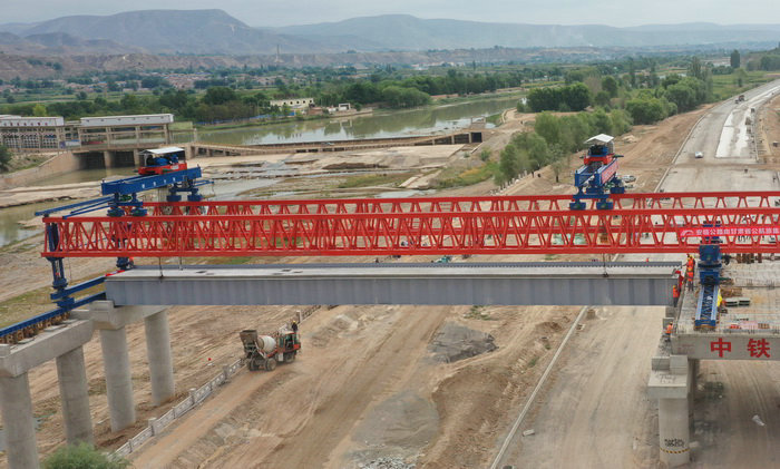 圖為架梁儀式現(xiàn)場 據(jù)項(xiàng)目部總工王雷星、工程部長李小偉介紹,洮河大橋全長888米,左右幅由17跨50米長的波紋鋼腹板鋼混組合梁跨越洮河,每跨架設(shè)兩片梁??缍冗_(dá)50米的波紋鋼腹板鋼混組合梁,在甘肅省是最長的,在中鐵二十一局也是首次施工。