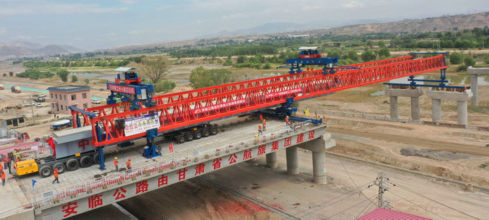 圖為架橋機(jī)和運(yùn)梁炮車就位項(xiàng)目辦副主任蔣超在架梁儀式中說:“安臨項(xiàng)目是省交通廳、省公航旅集團(tuán)重點(diǎn)建設(shè)項(xiàng)目,也是甘肅省路橋公路投資有限公司重點(diǎn)關(guān)注的項(xiàng)目,一標(biāo)段跨兩市兩縣,又處于東鄉(xiāng)縣洮河經(jīng)濟(jì)帶內(nèi),受到了臨夏州、東鄉(xiāng)縣各級(jí)政府的高度關(guān)注。洮河大橋作為連接臨洮縣、東鄉(xiāng)縣兩個(gè)少數(shù)民族區(qū)域的重要通道,它的建設(shè)意義十分重大。希望一標(biāo)項(xiàng)目部繼續(xù)貫徹安全第一的方針,確保施工安全,嚴(yán)格按照標(biāo)準(zhǔn)化要求,爭創(chuàng)優(yōu)質(zhì)工程,全面總結(jié)波紋鋼腹板鋼混組合梁施工工藝,形成創(chuàng)新科技成果,確保項(xiàng)目如期建成。”