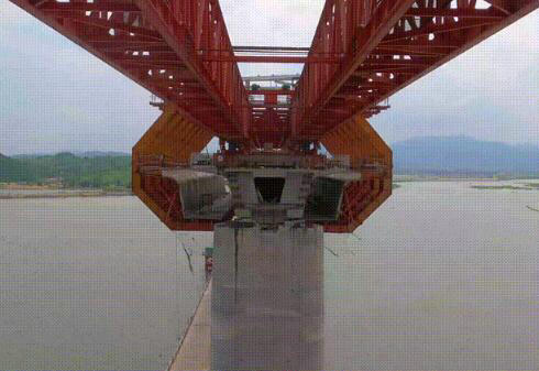 為此,項(xiàng)目部采用了上行式移動(dòng)模架進(jìn)行施工,較傳統(tǒng)的下行式移動(dòng)模架,機(jī)械化程度更高,既可實(shí)現(xiàn)箱梁內(nèi)、外模板的整體滑移、精準(zhǔn)定位,也可實(shí)現(xiàn)連續(xù)循環(huán)作業(yè),滿足技術(shù)、經(jīng)濟(jì)、結(jié)構(gòu)和運(yùn)行穩(wěn)定性、施工方便性等各方面的要求。同時(shí),單孔施工周期快、節(jié)省勞動(dòng)力、勞動(dòng)強(qiáng)度低,不受橋下場(chǎng)地限制,大大減少了對(duì)土地的占用以及對(duì)生態(tài)環(huán)境的破壞。