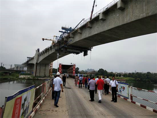 項(xiàng)目總工程師張生彥為他們詳細(xì)介紹了高鐵建設(shè)的進(jìn)展情況,介紹了高鐵建設(shè)的新技術(shù)、新工藝。目前亳州特大橋跨渦河連續(xù)鋼構(gòu)拱已經(jīng)施工到19號塊段,20號塊段為合攏段,預(yù)計(jì)9月底可完成全橋合攏,勝利在望,目前項(xiàng)目部做好最后沖刺的準(zhǔn)備。