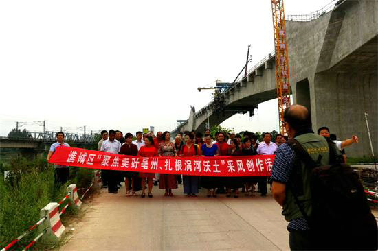 亳州訊(通訊員方世勇)金秋送爽、瓜果飄香,百里渦河、微風(fēng)漣漪。9月2日,中鐵二十一局五公司施工的商合杭高鐵亳州特大橋跨渦河連續(xù)鋼構(gòu)拱施工現(xiàn)場迎來了一批特殊的客人,他們是來自安徽省亳州市譙城區(qū)文學(xué)藝術(shù)界的藝術(shù)家們。大約有40余名攝影協(xié)會、作家協(xié)會、書法協(xié)會的藝術(shù)家和電視電臺記者,在亳州市譙城區(qū)鐵辦主任于成江等領(lǐng)導(dǎo)的陪同下齊聚亳州渦河,體驗(yàn)感受高鐵建設(shè)的氣息,開展“聚焦美好亳州、扎根渦河沃土”的采風(fēng)創(chuàng)作活動。