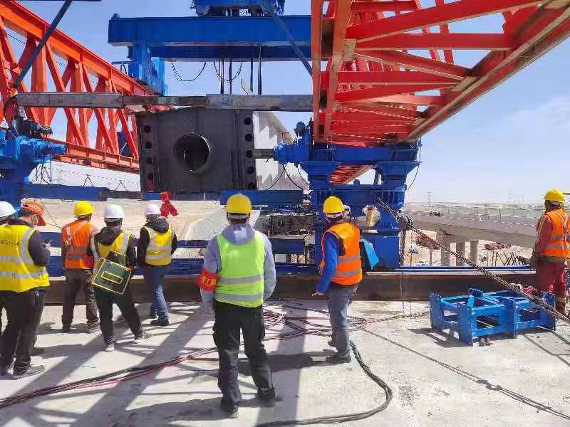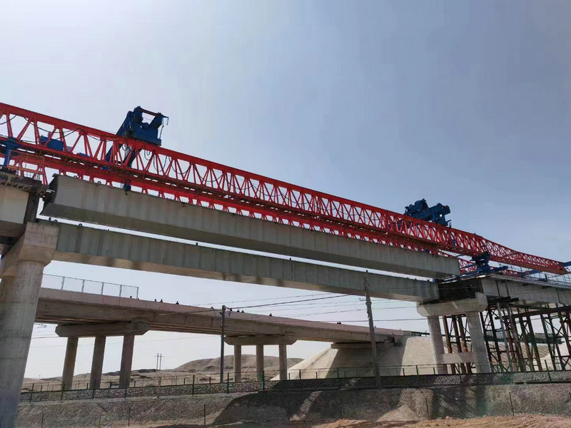 本次架梁施工采用QJ300-50 A3門(mén)式架橋機(jī),架橋機(jī)額定起重量300t,架梁跨度50m,為了保證架橋作業(yè)順利進(jìn)行,中鐵二十一局五公司七墩至瓜州公路上跨蘭新鐵路公鐵立交橋項(xiàng)目部認(rèn)真組織,加強(qiáng)人力、物資和機(jī)械等資源配置,分析各種風(fēng)險(xiǎn)源,制定相應(yīng)的應(yīng)急安全卡控措施。積極主動(dòng)與運(yùn)輸、設(shè)備和監(jiān)管部門(mén)通力合作,克服各種不利因素,嚴(yán)格按照封鎖計(jì)劃和施工方案有序組織施工,把施工對(duì)鐵路運(yùn)輸?shù)挠绊懡档搅俗畹?,安全、高效完成了跨鐵路架梁施工任務(wù)。