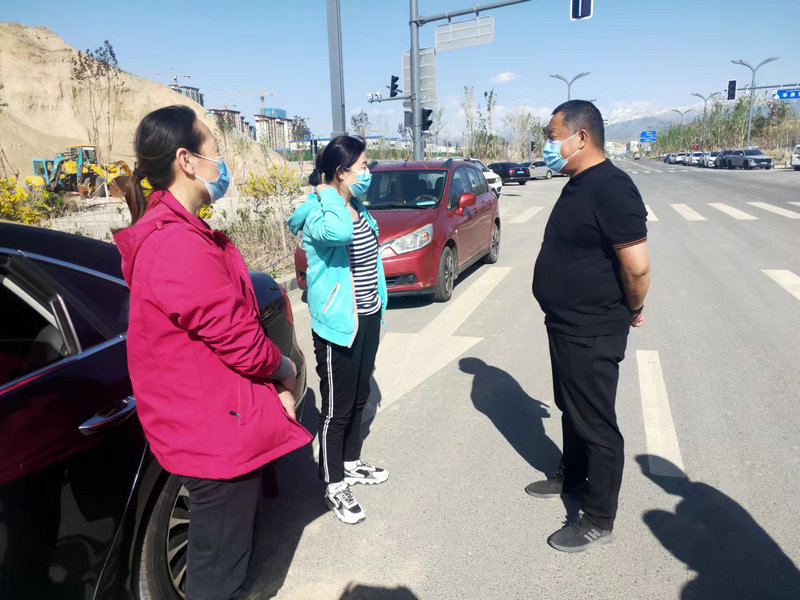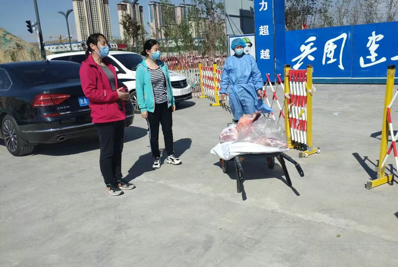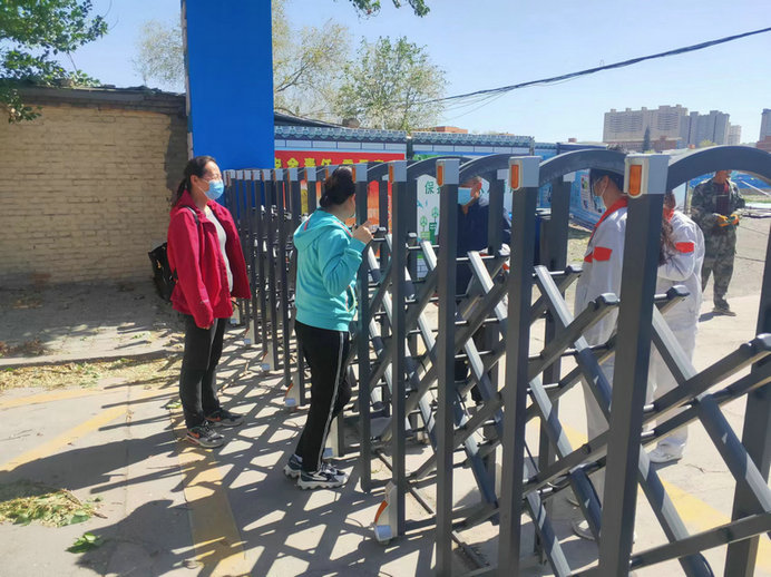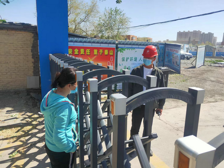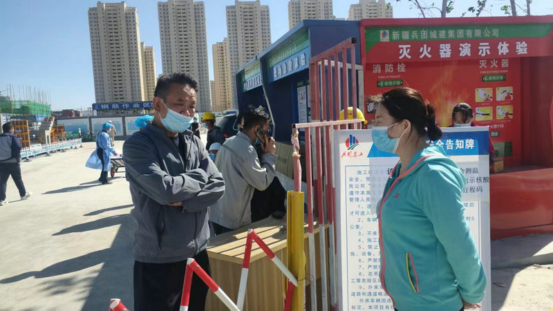 下圖為:兵團(tuán)五建黨委副書記、工會(huì)主席李彩英與黨群部副部長(zhǎng)王超華慰問“兵團(tuán)建工城建集團(tuán)十一師黨委黨校、民兵綜合訓(xùn)練基地建設(shè)項(xiàng)目”現(xiàn)場(chǎng)施工人員。因當(dāng)前屬于特殊時(shí)期,為確保人員健康、工程順利施工,該項(xiàng)目進(jìn)行封閉式管理,禁止人員隨意出入,只能隔著大門表達(dá)問候。