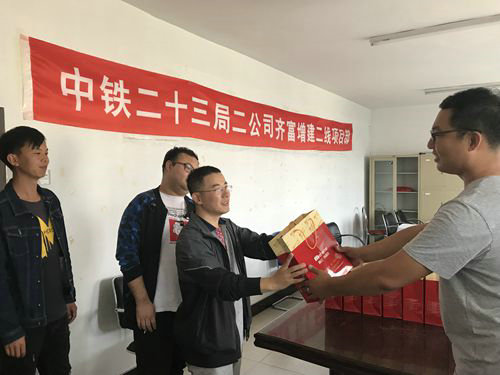 金秋送爽,丹桂飄香,在中秋佳節(jié)來臨之際,中鐵二十三局二公司齊富增建二線項(xiàng)目部工委會(huì)聯(lián)合中鐵二十三局二公司工會(huì)在K1+289.7公里鐵路道口人行天橋施工現(xiàn)場和項(xiàng)目部駐地辦公區(qū)開展迎雙節(jié)慰問活動(dòng),提前為項(xiàng)目部全體職工送上中秋的祝福。