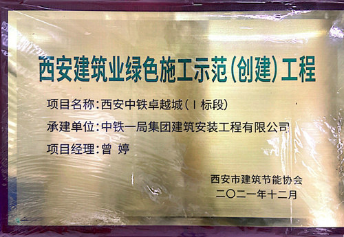(西安訊)近日,西安市建筑節(jié)能協(xié)會授予中鐵一局建安公司西安中鐵卓越城項目“西安建筑業(yè)綠色施工示范(創(chuàng)建)工程”榮譽稱號。