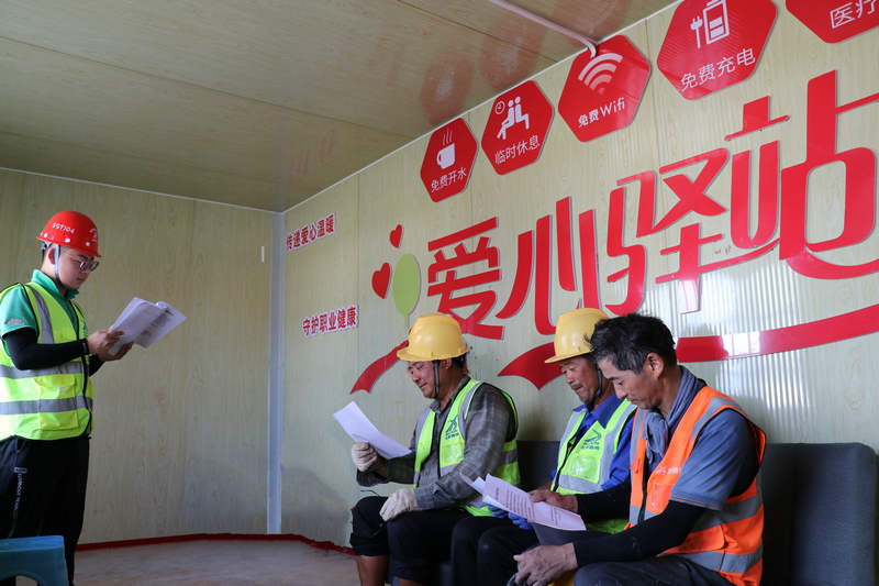 該項目充分利用愛心驛站這個“固定點”,組織專業(yè)人員“守株待兔”開展防汛、用電、臨邊防護(hù)、特種作業(yè)等各項安全知識培訓(xùn),通過愛心驛站以點帶面,做到“一傳十,十傳百”,促成項目一線工人安全知識的普及,也讓愛心驛站成為工人與項目管理人員相互交流、增進(jìn)友誼的溫馨家園。