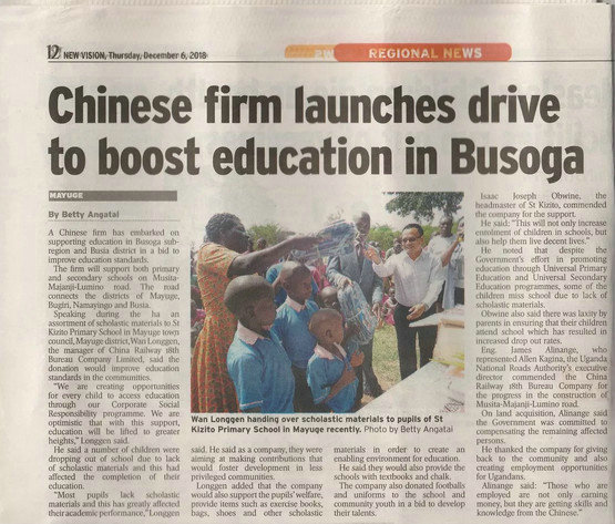 中國(guó)鐵路工程建設(shè)網(wǎng)天津訊(孫太東 劉士敏 報(bào)道)近日,烏干達(dá)最大報(bào)社《NEW VISION》新聞報(bào)道了十八局馬達(dá)加斯加公司烏干達(dá)項(xiàng)目部向當(dāng)?shù)匾患倚W(xué)捐贈(zèng)學(xué)習(xí)用品的愛心活動(dòng)。標(biāo)題的新聞是《中國(guó)公司在布索加發(fā)起了促進(jìn)教育的運(yùn)動(dòng)》,報(bào)道詳細(xì)地介紹了十八局烏干達(dá)項(xiàng)目部捐贈(zèng)情況,并配發(fā)了活動(dòng)照片。十八局主動(dòng)融入當(dāng)?shù)厣鐣?huì),積極履行社會(huì)責(zé)任,與當(dāng)?shù)毓蚕砗献靼l(fā)展成果,贏得了當(dāng)?shù)卣腿嗣竦膹V泛贊譽(yù)。