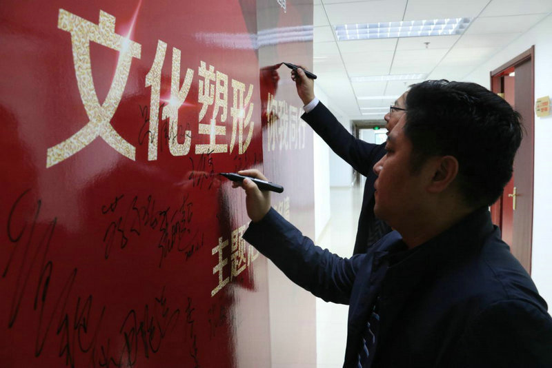 本期道德講堂設(shè)有主題簽名、看宣傳片、唱歌曲、講故事、誦經(jīng)典、送吉祥六個環(huán)節(jié)。下午13時,參加活動的職工陸續(xù)來到簽名墻前,用筆簽下了自己的一份承諾,拉開了活動的序幕。