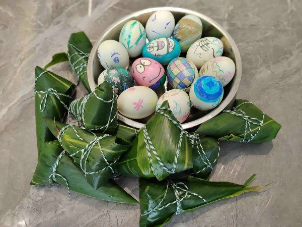 另一邊,職工們正聚精會神地在咸鴨蛋上繪制圖案,有的畫上自己喜歡的卡通人物彰顯著自己的青春個(gè)性,有的天馬行空腦洞大開進(jìn)行抽象主義創(chuàng)作,有的則畫上寓意平安喜樂的花紋和圖案,寄托著對端午節(jié)“平安喜樂、國泰民安”的美好愿望。