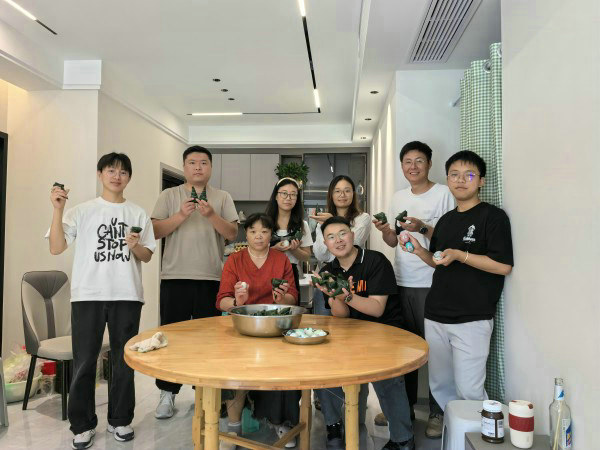 “來嘍!”隨著一聲吆喝,一張張?zhí)崆扒逑春玫聂杖~和提前泡好的糯米被端上了桌。項(xiàng)目職工們圍坐在餐桌旁摩拳擦掌、躍躍欲試,但由于大部分人都沒包過粽子,剛剛開始的時(shí)候,粽子長得是歪七扭八,引得大家互相吐槽,笑成一片。在有經(jīng)驗(yàn)的同志的教學(xué)下,大家慢慢地找到了訣竅,一個(gè)個(gè)粽子變得有棱有角、整齊漂亮起來。