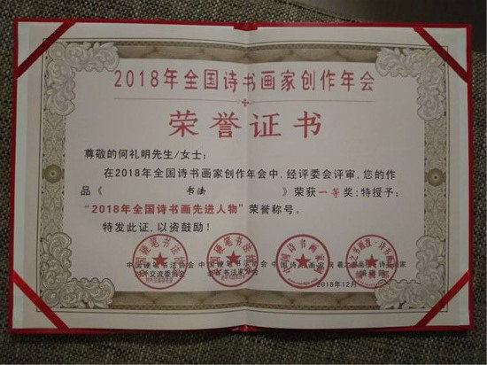 2018年12月25日至28日,由中國硬筆書法協(xié)會(huì)對外交流委員會(huì)、中國硬筆書法協(xié)會(huì)老年峰會(huì)、中國詩書畫家網(wǎng)、羲之書畫報(bào)聯(lián)合舉辦的2018年全國詩書畫家創(chuàng)作年會(huì)頒獎(jiǎng)盛典在海南三亞舉行。何禮明書法作品榮獲2018年全國詩書畫家創(chuàng)作年會(huì)一等獎(jiǎng)。