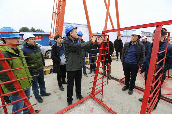 項(xiàng)目班子成員與督查組領(lǐng)導(dǎo)現(xiàn)場(chǎng)交流 督查組到施工現(xiàn)場(chǎng)的第一站是制梁場(chǎng)。占地30多畝的制梁場(chǎng)已建設(shè)完工,即將進(jìn)行首片梁預(yù)制。兩臺(tái)紅色的龍門吊、幾十個(gè)制梁臺(tái)坐、鋼筋安裝綁扎胎模、幾套綠色嶄新的制梁模板已安裝就位。該梁場(chǎng)承擔(dān)著28座大中小橋共644片箱梁、T梁的預(yù)制任務(wù)。在制梁場(chǎng),項(xiàng)目經(jīng)理?xiàng)畋?、總工李偉鋒為督查組詳細(xì)介紹了梁場(chǎng)建設(shè)情況。督查組對(duì)綁扎鋼筋胎模上的卡具產(chǎn)生了興趣,經(jīng)理?xiàng)畋笞髁俗屑?xì)解釋:“我們創(chuàng)新安裝卡具的目的,就是嚴(yán)格控制每根鋼筋的間距,做到不差分毫,使鋼筋布置受力完全符合設(shè)計(jì)標(biāo)準(zhǔn)。”質(zhì)監(jiān)局的一位領(lǐng)導(dǎo)聽后,稱贊說這個(gè)創(chuàng)意很好。