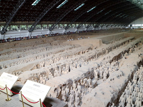 首先,大巴先來到西安秦始皇帝陵博物館,饒有興致的參觀了兵馬俑。兵馬俑,即秦始皇兵馬俑,簡稱秦兵馬俑或秦俑,又被稱為“復(fù)活兵團(tuán)”,是古代墓葬雕塑的一個類別,位于今陜西省西安市臨潼區(qū)秦始皇陵以東1.5公里處的兵馬俑坑內(nèi),是第一批全國重點文物保護(hù)單位、第一批中國世界遺產(chǎn),被譽為“世界第八大奇跡”。