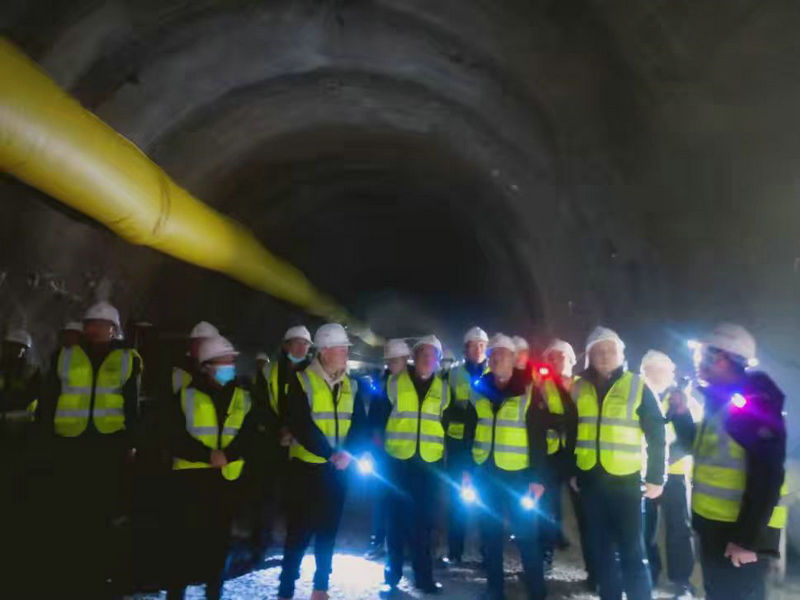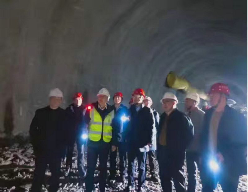 總承包部指揮長李兵(前排右二)、項目部經(jīng)理阮超(前排左二)在中梁山隧道進口掌子面檢查指導(dǎo)