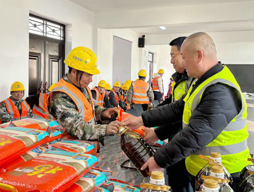 在項目會議室,王慶一行將節(jié)前為勞務工精心準備的大米、食用油等生活物資以及節(jié)日慰問品逐一送到了勞務工及及家屬手中。慰問組與勞務工朋友們進行了親切的交流,深入了解了他們的工作和生活狀況,對勞務工在社會發(fā)展中所作出的貢獻表示感謝,并向他們致以新春的祝福。