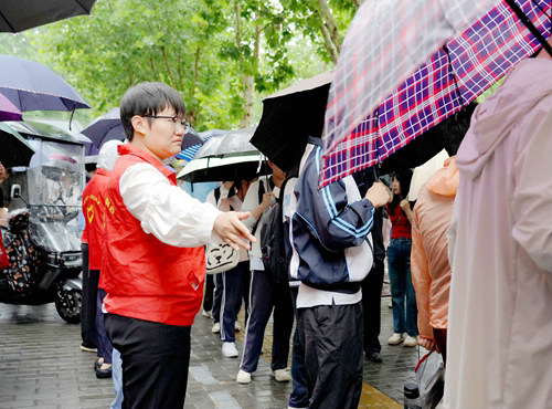 7日清晨,因雨水天氣,在社區(qū)的統(tǒng)一安排下,志愿者們迅速在學(xué)校門口搭建了應(yīng)急愛(ài)心助力志愿服務(wù)點(diǎn),為考生和等待的家長(zhǎng)們提供遮風(fēng)擋雨的地方,同時(shí)為考試和家長(zhǎng)提供礦泉水、應(yīng)急文具、休息板凳等。待考生進(jìn)入考場(chǎng)后,志愿者主動(dòng)邀請(qǐng)家長(zhǎng)進(jìn)入帳篷下避雨,與家長(zhǎng)們聊及高考注意事項(xiàng),緩解家長(zhǎng)的焦慮心情。過(guò)程中,志愿者們積極協(xié)助太乙路辦事處維持考場(chǎng)外紀(jì)律秩序,文明引導(dǎo)行人和車輛停放秩序,全力保障考點(diǎn)周邊環(huán)境??荚嚱Y(jié)束,志愿者們?yōu)槲磾y帶手機(jī)的考生提供電話服務(wù),幫助及時(shí)聯(lián)系家長(zhǎng),節(jié)約考生時(shí)間,做好充足午休,為下一場(chǎng)考試做好充分準(zhǔn)備。青年志愿者們高度的責(zé)任感和熱情的服務(wù)態(tài)度,成為西安市鐵一中考場(chǎng)外一道亮麗的風(fēng)景線。