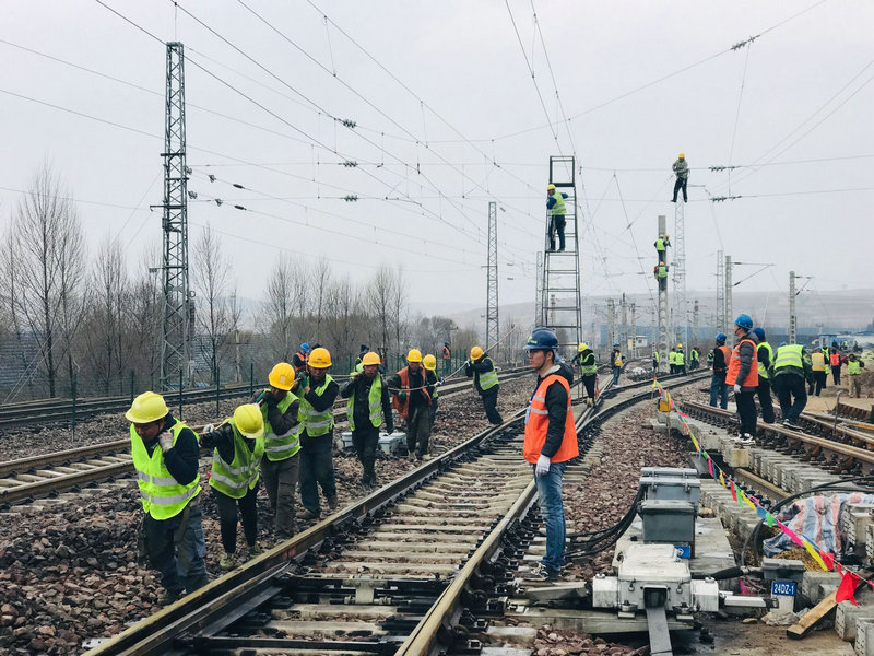 同煤岢嵐鐵路項(xiàng)目對(duì)接寧岢鐵路共有11次Ⅲ級(jí)封鎖施工,這是第四階段封鎖施工,也是一次重點(diǎn)控制性施工。主要施工項(xiàng)目有電務(wù)復(fù)聯(lián)試驗(yàn)、電氣化接觸網(wǎng)改造等。工程量包括完成架設(shè)承力索880米,安裝腕臂2套,安裝分段絕緣子2處;室外設(shè)備送電調(diào)試道岔轉(zhuǎn)轍機(jī)調(diào)試3組、信號(hào)機(jī)調(diào)試5架;室內(nèi)外設(shè)備聯(lián)鎖試驗(yàn)軌道電路區(qū)段5個(gè)。
