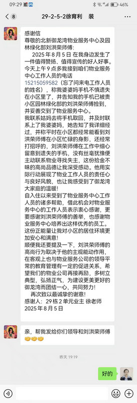 物業(yè)服務中心項目二部主管接到手機后,通過手機內的 “敬老卡” 信息,迅速鎖定失主為三街區(qū) 29-2-5-2 的徐育利,并及時聯(lián)系其前來領取。當徐育利得知撿到手機的是平日工作認真負責、待人熱情的劉洪榮師傅時,難掩激動之情:“劉師傅平時修剪園林就一絲不茍,這次還主動歸還手機,太讓我感動了!” 當晚,便寫下感謝信,為劉洪榮的善舉點贊,也向北新宜邦物業(yè)培養(yǎng)出這樣的優(yōu)秀員工致謝。?