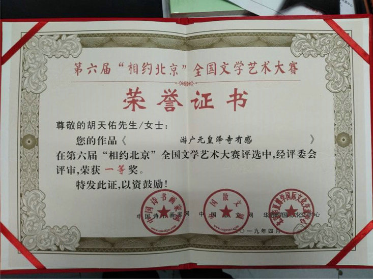 2019年第六屆“相約北京”全國文學(xué)藝術(shù)大賽由中國詩書畫家網(wǎng)、中國散文網(wǎng)、華夏博學(xué)國際文化交流中心主辦,4月26日至29日在北京舉行頒獎儀式,中國人民解放軍原濟(jì)南軍區(qū)副司令員、濟(jì)南空軍司令員、解放軍中將郭玉祥;全國政協(xié)原副秘書長、全國政協(xié)港澳臺僑委員會原副主任、著名書法家張道誠;中國音樂文學(xué)學(xué)會副主席、原北京軍區(qū)政治部創(chuàng)作室主任、國家一級詞作家石祥;原國家工商總局公平交易局副局長、國家工商總局老干部辦公室主任、中央國家機(jī)關(guān)書法家協(xié)會副秘書長李文章;中國美術(shù)家協(xié)會理事、中國華僑畫院院長、國家一級美術(shù)師張清智;中國美術(shù)家協(xié)會理事、中國國家博物館書畫研究創(chuàng)作中心主任、國家一級美術(shù)師石峰;中國紅十字書畫院執(zhí)行院長、北京藝術(shù)藝術(shù)創(chuàng)作中心常務(wù)副主任王建勛;中國硬筆書法協(xié)會副秘書長、中國詩書畫家網(wǎng)總編輯、《羲之書畫報(bào)》社副總編輯邵建國等領(lǐng)導(dǎo)專家出席大會。