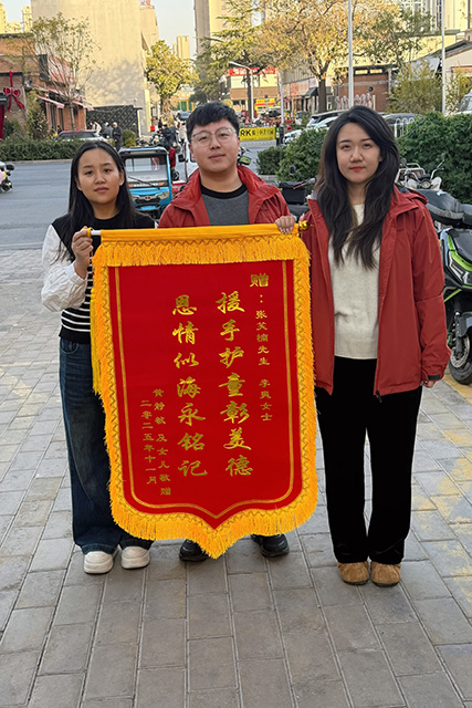 這份及時的援手讓黃女士深受感動。得知張笑楠、李爽夫妻第二天就要結(jié)束婚假返回濟南工作,黃女士連夜定制了一面錦旗,翌日一早便送到二人手中。“援手護童彰美德,恩情似海永難忘”,錦旗上的話道出一位母親最深切的感激。黃女士握著二人的手,聲音哽咽:“要不是你們,孩子真不知道會怎樣……”