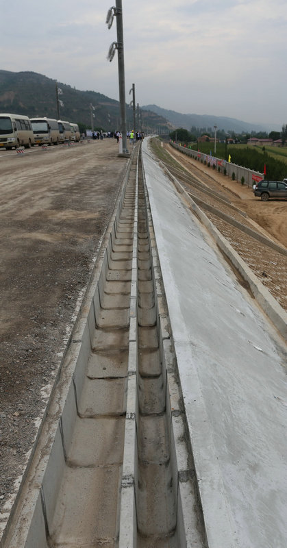 圖為已完工的路基電纜槽 參觀工地后,觀摩團來到中鐵二十一局集團路橋公司銀西高鐵慶城制梁場,在會議室召開“中鐵二十一局集團銀西高鐵YXZQ-5標(biāo)路基電纜槽施工交流會”。銀西鐵路有限公司副總經(jīng)理馬新民主持會議,并作了講話。按照會議議程,首先觀看了20分鐘一工區(qū)、三工區(qū)電纜槽安裝施工視頻,再由中鐵二十一局銀西項目部向與會人員匯報電纜槽施工工藝。