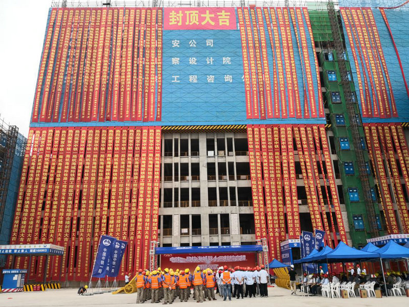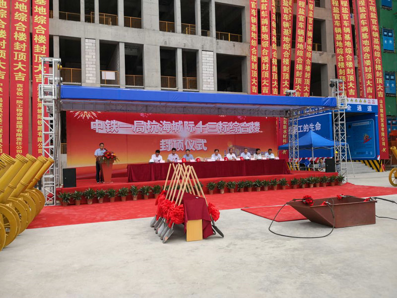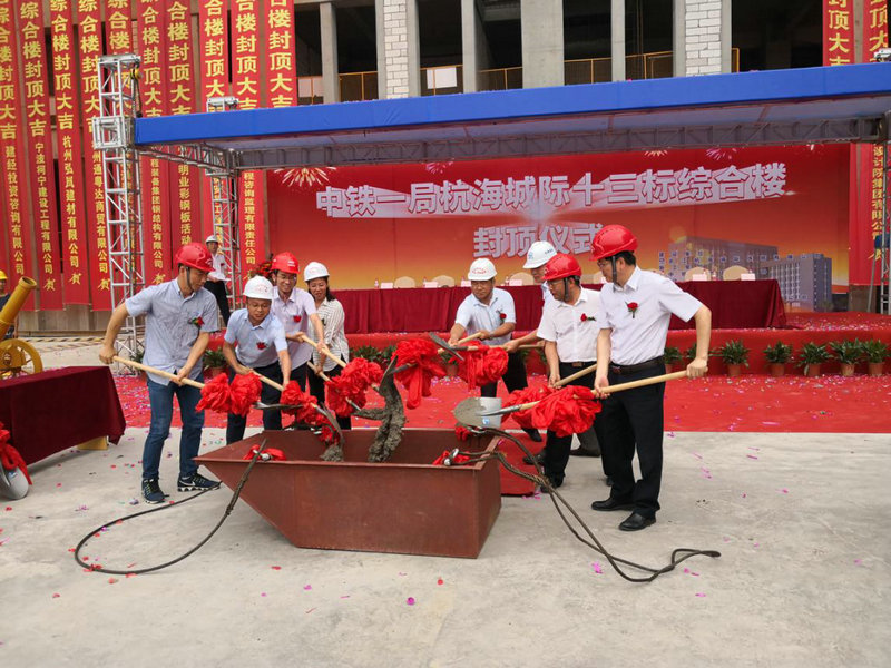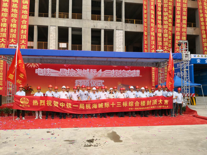 ?。ê幱崳?月10日,中鐵一局杭海城際鐵路鹽官車輛基地最大單體工程——綜合樓順利實現(xiàn)主體封頂。 浙江省交投集團(tuán)軌道部副總經(jīng)理陳明、杭海城鐵公司總經(jīng)理言建標(biāo)、海寧市杭海城鐵指揮部副總指揮湯治安、杭海城鐵公司副總經(jīng)理鄧建林、中鐵(上海)投資有限公司杭海城際項目部項目經(jīng)理張艷文、中鐵一局建安公司工會主席王淑娟以及來自監(jiān)理、設(shè)計單位的領(lǐng)導(dǎo)和嘉賓出席封頂儀式。項目部職工和勞務(wù)工代表共100余人參加。