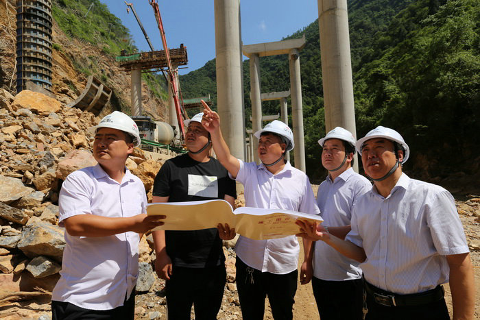 經(jīng)理卓杰(中)書記程文華(右一)、副經(jīng)理劉磊磊(右二)、總工儲定海(左二)、副經(jīng)理張銳軍(左一)在現(xiàn)場研究施工方案