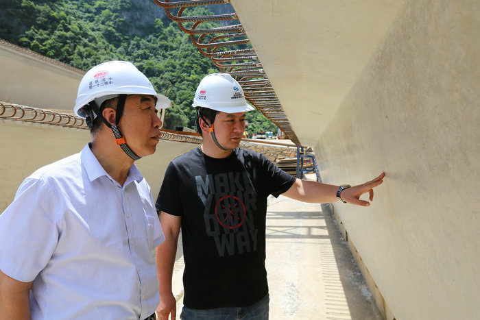 項(xiàng)目書記程文華(左)、副經(jīng)理劉磊磊(右)檢查箱梁質(zhì)量