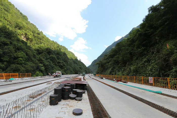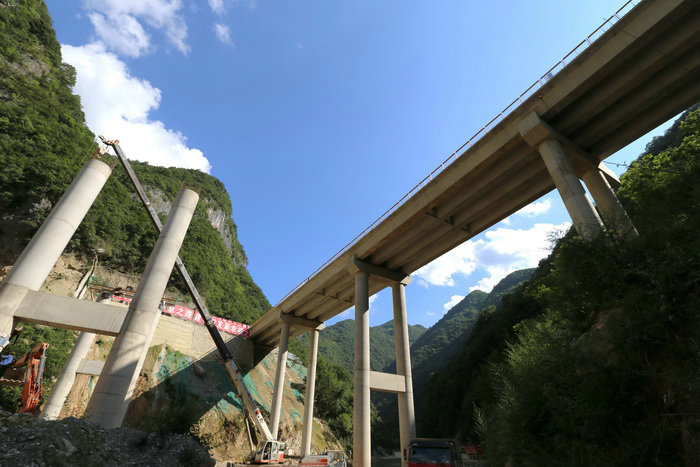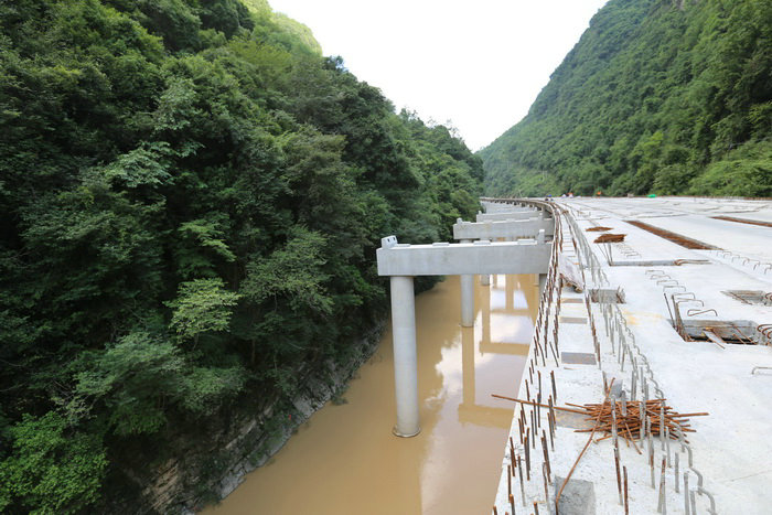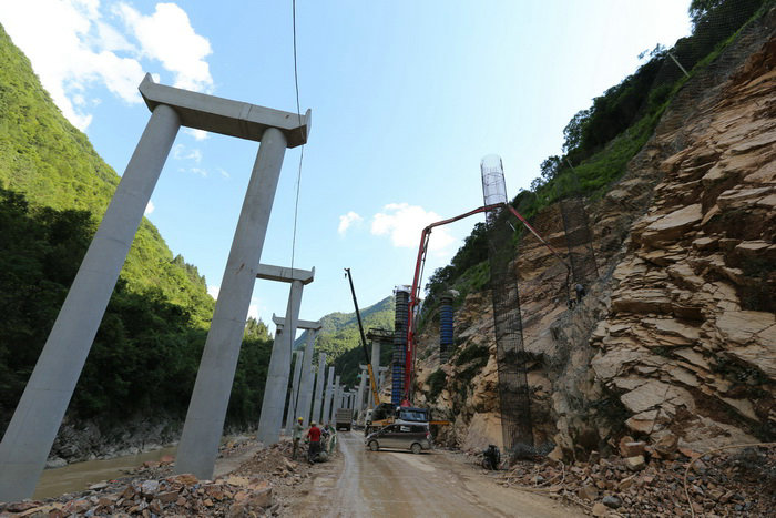 綿延不絕的秦巴山脈深處,西鎮(zhèn)高速公路建設(shè)正如火如荼。如果不到現(xiàn)場,是難以想象該項(xiàng)目的建設(shè)難度。西鄉(xiāng)縣古城鎮(zhèn)是西鎮(zhèn)高速的起點(diǎn)一標(biāo)段,路線往南順著涇洋河上游就一頭扎進(jìn)了秦巴山,兩邊是數(shù)百米高的高山,涇洋河順著山勢沿河而下,河床寬的地方只有幾十米,窄的地方僅有十多米。有30多公里為無人區(qū),深山峽谷中除了河流沒有路。為了修建西鎮(zhèn)高速公路,業(yè)主提前兩年順河修建了幾十公里的便道,但其等級很低會車?yán)щy,材料運(yùn)輸極不方便。西鎮(zhèn)高速地處秦巴山腹地,兩山夾一河,兩邊是綿延不絕的高山,沒有一塊平地,且河道很窄,由于地勢獨(dú)特,西鎮(zhèn)高速除隧道外,整條線路全部設(shè)計(jì)在涇洋河中。