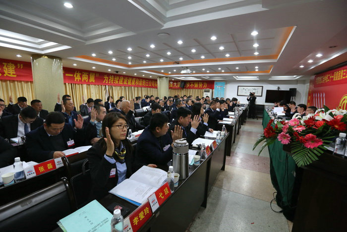 圖為舉手表決 9點(diǎn)零5分,由公司工會主席周普華主持召開大會預(yù)備會議。首先由公司工會辦公室主任范軼群作大會籌備工作報(bào)告;公司黨委副書記、紀(jì)委書記郝禮作大會代表資格審查情況報(bào)告;通過大會議程(草案);通過大會表決辦法;通過大會監(jiān)票人組成方案;通過大會主席團(tuán)組成方案;通過大會主席團(tuán)成員建議名單;通過大會常務(wù)主席、秘書長建議名單。