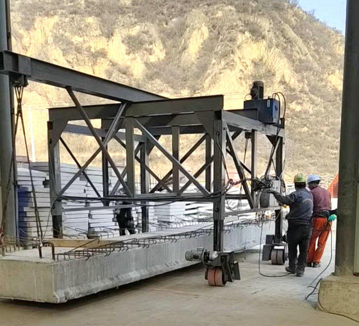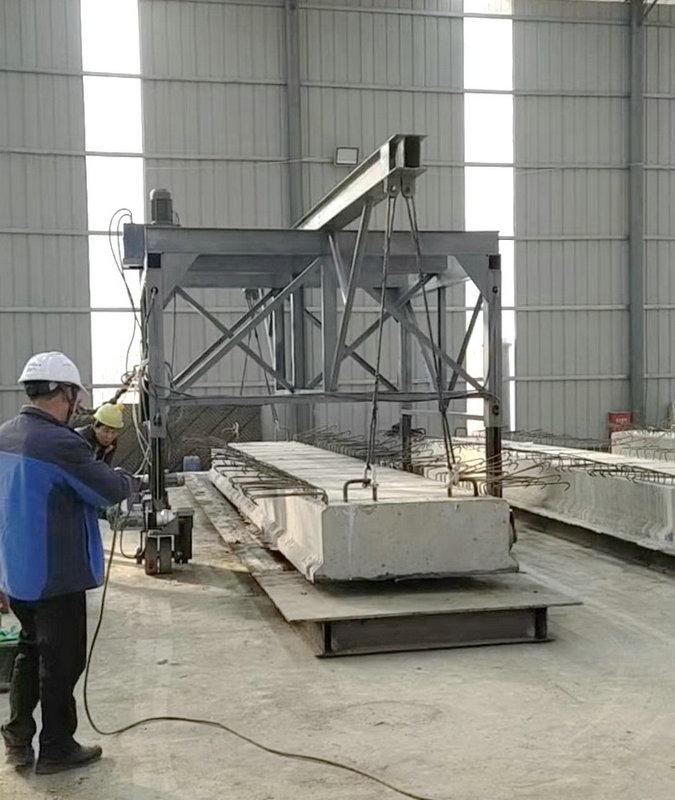 圖為起吊11噸重的梁板 真是行家一出手,就知有沒有。就在大家一籌莫展之際,擁有近30項(xiàng)國(guó)家實(shí)用新型發(fā)明專利的馬小利來到現(xiàn)場(chǎng)。他說:“你們只管抓緊施工制梁臺(tái)座,準(zhǔn)備制梁,室內(nèi)移梁的事我來解決。”經(jīng)過查看,馬小利的腦海里已有了初步的實(shí)施方案,他決定研制一臺(tái)移梁設(shè)備來解決這個(gè)難題,項(xiàng)目經(jīng)理吳小峰立即拍板支持,希望加快研發(fā)速度。