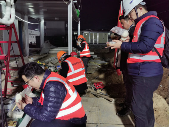 到達(dá)現(xiàn)場(chǎng)后,臨時(shí)黨支部將11名黨員分為現(xiàn)場(chǎng)服務(wù)保障、機(jī)關(guān)后勤保障、現(xiàn)場(chǎng)風(fēng)管安裝、現(xiàn)場(chǎng)配電作業(yè)、現(xiàn)場(chǎng)外圍應(yīng)急5個(gè)先鋒崗,大家各自帶領(lǐng)所在崗位的人員,在3天4夜的時(shí)間里堅(jiān)守崗位,奮勇突擊,為各項(xiàng)施工任務(wù)的順利完成提供了強(qiáng)大的組織保證和思想保證。
