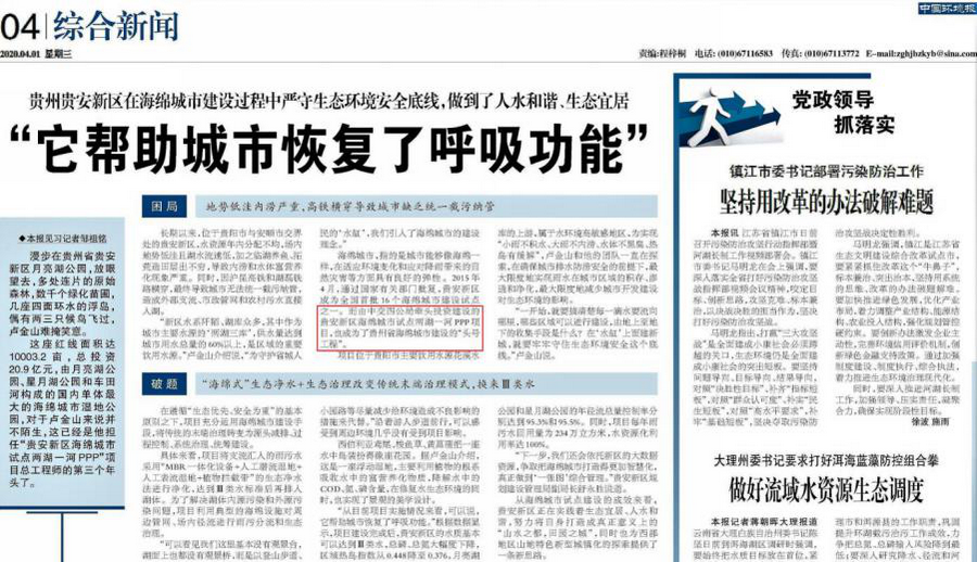 在1500多字的篇幅中,記者真實地還原了中交四公局聯(lián)合體建設者智慧治水的艱辛歷程:開工前項目面臨“地勢低洼內(nèi)澇嚴重及高鐵橫穿導致城市缺乏統(tǒng)一截污納管”的困局,通過借助低影響開發(fā)理念,技術團隊創(chuàng)新采用“‘海綿式’生態(tài)凈水+生態(tài)治理改變傳統(tǒng)末端治理模式”進行破局,最終成功“換來Ⅲ類水”,如愿踐行了“守護省城人民‘水缸’”的初心。盛世治水,河湖安瀾;正如記者所言:目前,“由中交四公局牽頭投資建設的貴安新區(qū)海綿城市試點兩湖一河PPP項目,也成為了貴州省海綿城市建設的‘頭號工程’”。