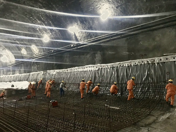 工人在橫番6號盾構(gòu)井綁扎導(dǎo)洞鋼筋
