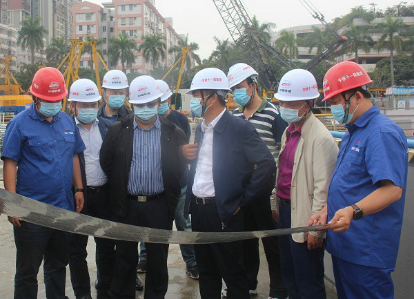 中鐵十一局總經(jīng)理陳志明(右3)在番禺廣場站調(diào)研時對項目提出保開通有關(guān)要求